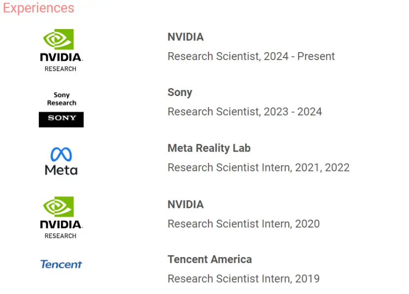 在Meta和英伟达实习过,现为英伟达研究科学家。