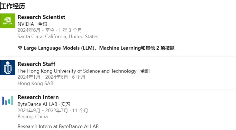 曾经在字节AI LAB做过实习,2024年加入英伟达担任研究科学家。