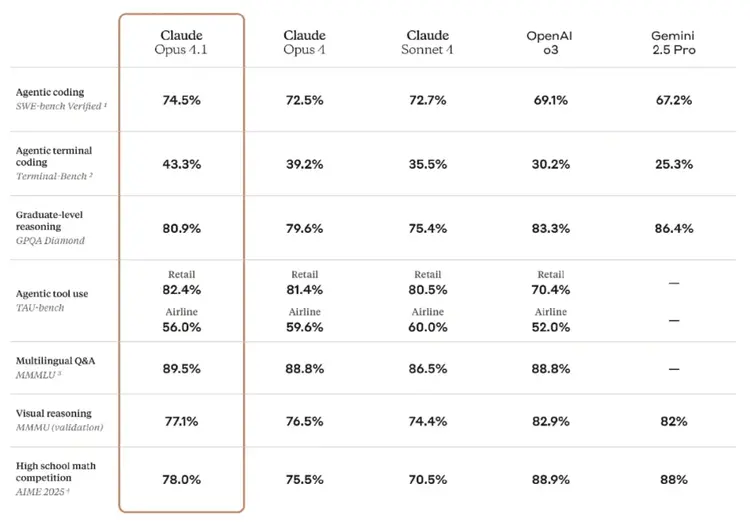 Anthropic则继续在它最锋利的“矛”上加码。新发布的Claude 4.1 Opus,目标明确——成为最强的编程助手。
