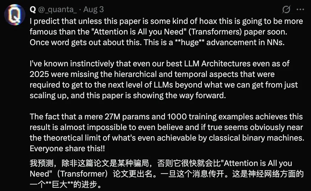 虽然,HRM被指参数太小、训练范围有限,只针对特定领域表现好,无法泛化到领域外,并不通用。但有人认为小而精的模型或许在某些角度上更智能。