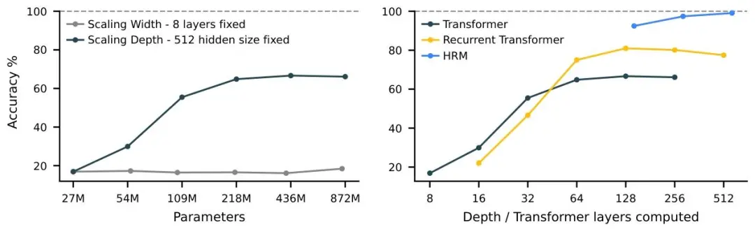 HRM则克服了这一限制,能有效利用计算深度实现近乎完美的准确率。