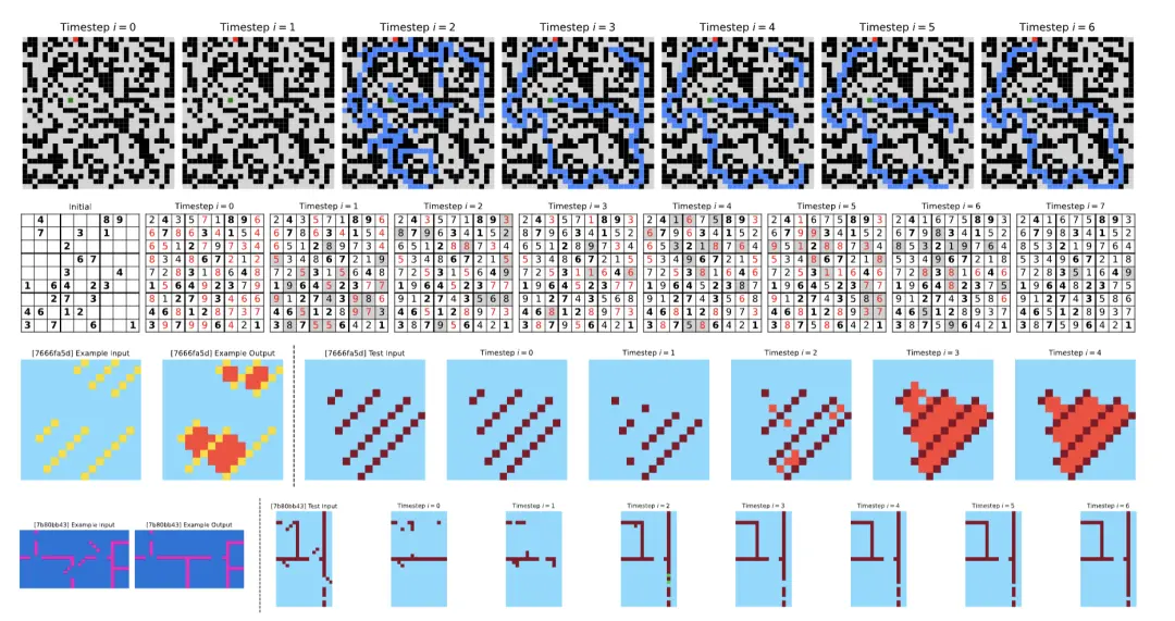 下图通过可视化中间步骤,验证了HRM的分层推理机制能够有效拆解复杂任务,通过渐进式计算逼近正确结果,而非依赖黑箱式的一次性输出。
