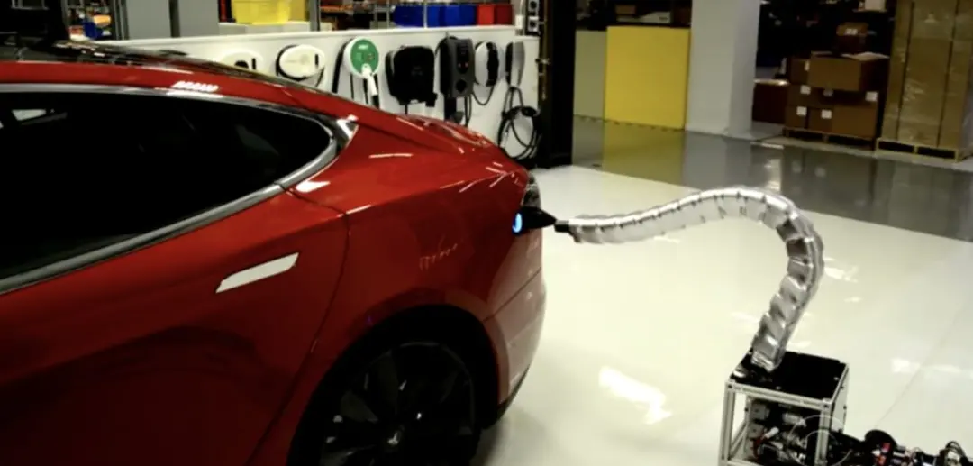 之前特斯拉的设想方案是“蛇臂充电”,像蛇形一样的充电器可以感应到汽车充电口,然后自动插入充电。