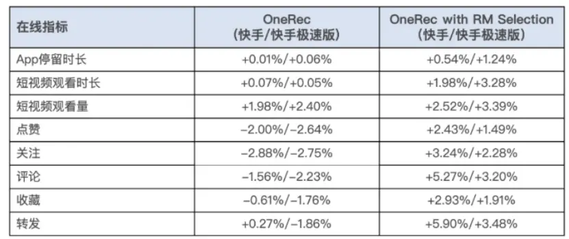 我们可以直接来看效果,快手针对OneRec上线后进行了一周 5% 流量 AB测试,类似于医药行业的头对头实验,在点赞、关注、评论等所有交互指标上均获正向收益。