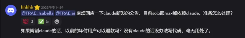 Trae的管理员在官方Discord中称,Claude仍然可用,并且表示Trae目前没有阉割Claude的消息,敦促用户“暂时不要考虑退款”。但这种不确定性已经让用户感到不安。