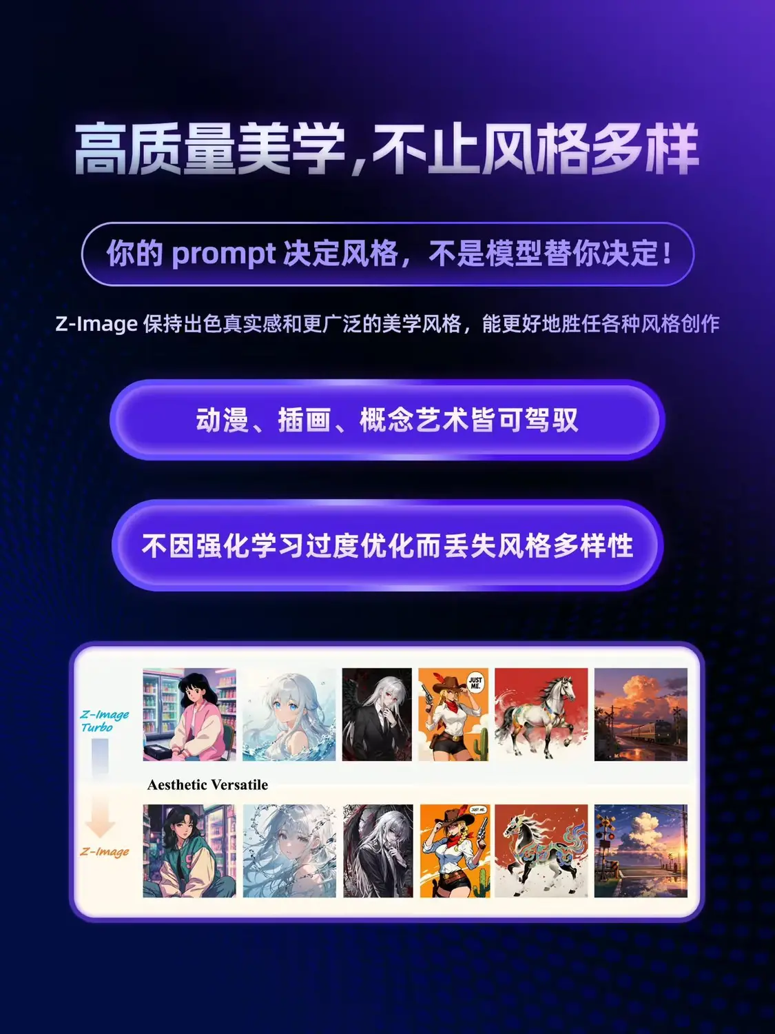 Z-Image 宣称打破单一维度的写实局限:无论是追求光影的 Photorealism,还是具有情绪张力的动漫与数字艺术,Z-Image 均能捕捉并重构每一处风格细节。
